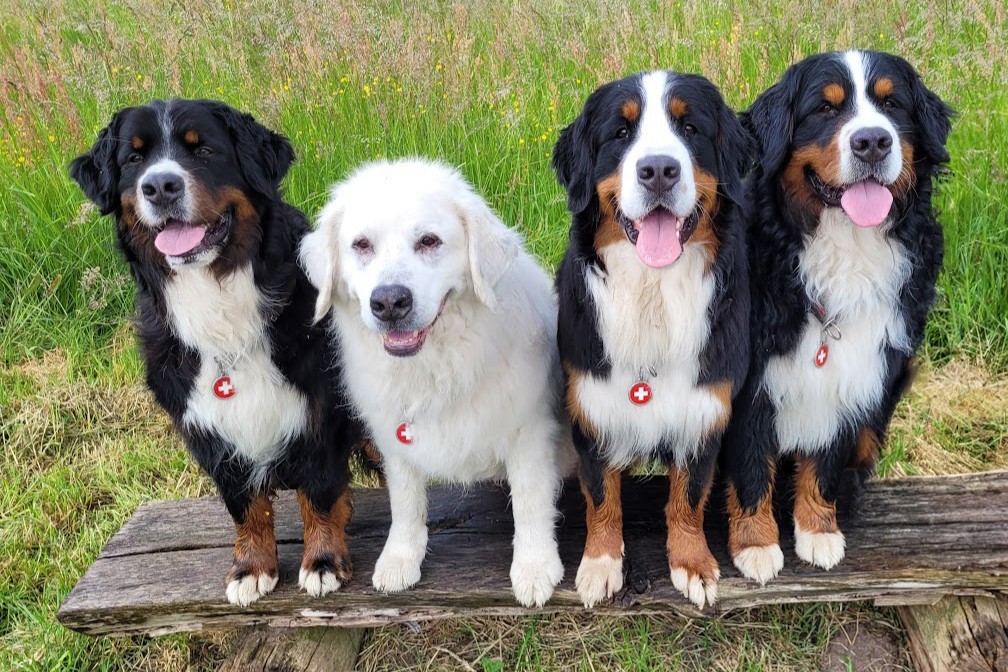 Im Alter von acht Wochen wurden sie getrennt. Manni zog nach Freiolsheim und Oki blieb bei Mama und den anderen Bernern in Vollmaringen. Regelmässig durften sie sich bei gegenseitigen Besuchen sehen und ausgiebig miteinander toben. Wie das Schicksal so spielt, wurde aus Frauchen von Oki und Herrchen von Manni ein Paar. Endlich durfte Oki zu seinem allerbesten Freund nach Freiolsheim ziehen und aus der Sandkasten- wurde eine Männerfreundschaft.